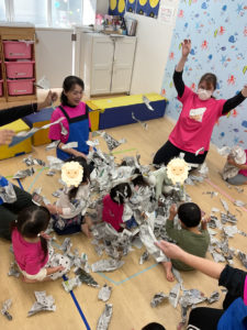 アリス郡家保育園今日は新聞紙遊びをして楽しんだよ♪